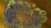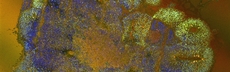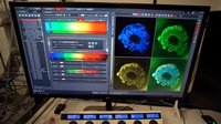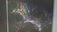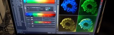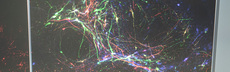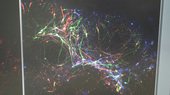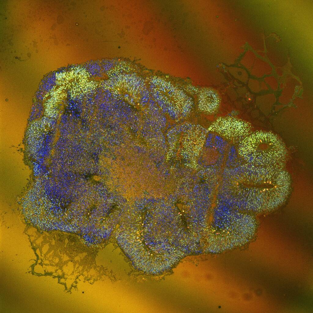 Die Bilder auf dem Monitor erinnern an bunt eingefärbte Korallen. Was dort leuchtet, sind jedoch die unterschiedlichen Eiweiße im Gehirn-Organoid.